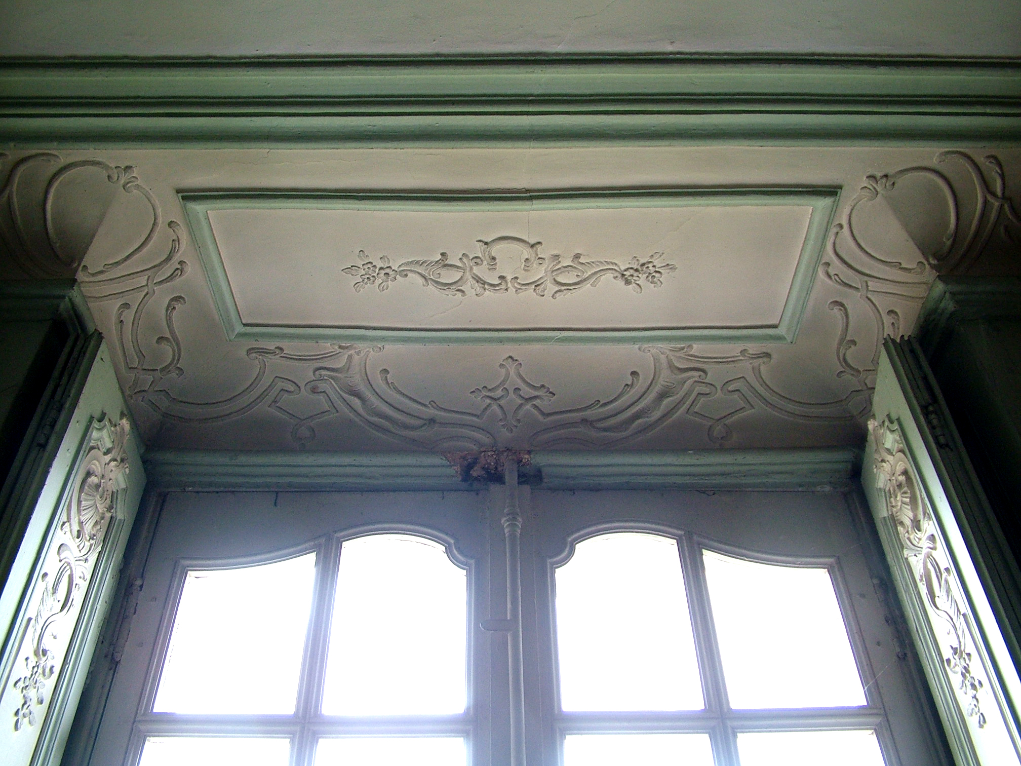 Chambre du premier étage de la travée centrale du logis : corniche et volets intérieurs de la fenêtre.Immatriculation